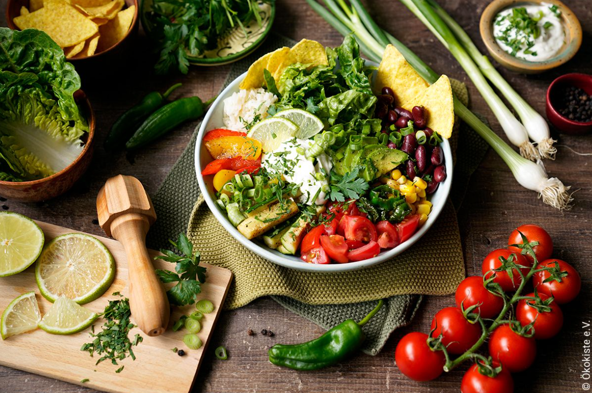 • Nun die Burrito Bowl in breiten Schüsseln oder Schalen zusammenstellen: Zuerst etwas Reis in ein Achtel jeder Schüssel geben. Dann alle anderen Zutaten getrennt voneinander daneben verteilen. Zwiebeln und Bratpaprika können auch darüber gestreut werden. Bei Bowls darf man kreativ sein. Achtung: Bereitet man die Bowl vor, z.B. als Meal Prep oder Salat, sollten die Zwiebeln erst kurz vorm Servieren untergerührt werden.