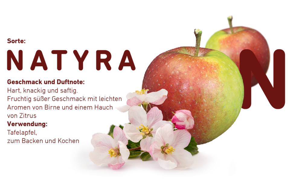 Zusätzlich findet sich im Angebot im Sommer die hoch aromatische Sorte Natyra. Diese Sorte bringt mittelgroße, rote Früchte mit festem, knackigen, saftig, süßem Fruchtfleisch hervor. Sie eignet sich perfekt als Tafelapfel.