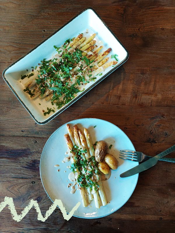 4. Nun den gerösteten Spargel auf einer Platte anrichten und die Tahin-Zitronen-Soße darüber verteilen. Anschließend den gehackten Rucola und die gerösteten Sonnenblumenkerne darüber verteilen.
