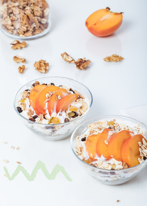 Fruchtiger Joghurt-Snack: Mische Naturjoghurt mit einer Handvoll Beeren, gehackten Nüssen und einem Schuss Honig für eine süße und gesunde Zwischenmahlzeit.