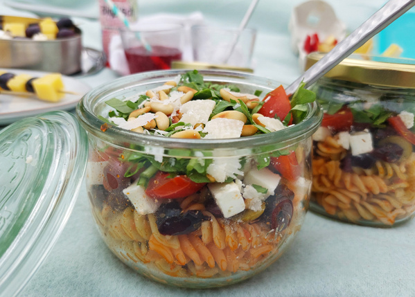 Nudeln nach Packungsanleitung zubereiten und auskühlen lassen. mit dem Pesto vermengen. Alle weiteren Zutaten kleinschneiden. Nun eine Schicht aus Oliven und Fetawürfeln, dann Cocktailtomaten und anschließend eine Schicht Rucola ins Glas füllen. Zum Schluß die Pinienkerne und etwas gehobelten Parmesan oben drauf streuen. Fertig!
