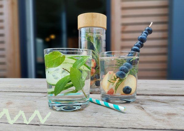 Die einfachste Art normales Wasser zu pimpen, ist natürlich, ihm Geschmack hinzuzufügen. "Infused Water" bedeutet so viel wie "aufgegossenes Wasser", meint aber eher das Aromatisieren von (Leitungs-)wasser mit Früchten, Gemüse und/oder Kräutern. Ohne Zucker und größeren Aufwand. Also einfach Lieblingsfrüchte kleinschnibbeln und ab damit ins Wassser. Infused Water lässt sich auch superleicht morgens in einer Soulbottle o. ä. vorbereiten und mit zur Arbeit oder zum Sport nehmen. Klassiker sind die Varianten mit Minze und Zitrone, aber warum nicht mal Pfirsich, Blaubeere oder Gurken mit ins Wasser mixen?