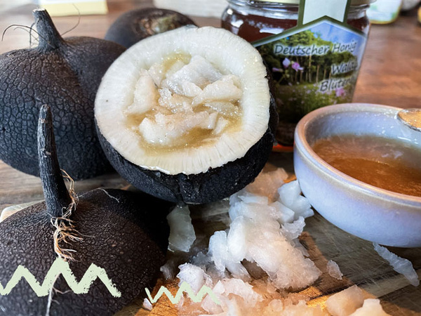 Diese Saisonabhängigkeit macht den schwarzen Rettich zu einem perfekten Gemüse für saisonale und regionale Ernährung, was wiederum die Umwelt schont und lokale Produzenten unterstützt. Wir bekommen unseren schwarzen Rettich vom Bioland Gemüsehof Weßling in Neuenkirchen.