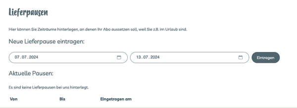 Planst du eine Reise oder eine kurze Auszeit? Kein Problem! In deinem Benutzerprofil kannst du ganz unkompliziert Lieferpausen selbst eintragen. So vermeidest du, dass deine Biokiste vor deiner Tür landet, während du weg bist.