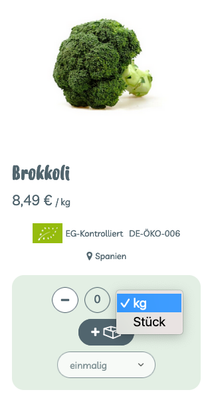 Um einen gewünschten Artikel in den Warenkorb zu legen, kannst du bei vielen Artikeln wählen, ob du in kg oder Stück bestellen möchtest. Über das Plus-Symbol kannst du die Menge erhöhen. Mit dem Minus-Symbol reduzierst du die Menge. Oder du gibst die gewünschte Menge in kg oder Stück einfach in das Mengenfeld ein. Sobald sich das Feld dunkel färbt, ist die gewünschte Menge im Warenkorb. Es gibt also keinen Button „in den Warenkorb legen. Möchtest du den Artikel wieder aus dem Warenkorb entfernen, klicke auf das Minus-Symbol oder überschreibe das Zahlenfeld mit der Zahl Null. Ist das Feld wieder hell gefärbt, befindet sich der Artikel nicht mehr im Warenkorb. Alternativ kann man über den Warenkorb ebenfalls Änderungen vornehmen.