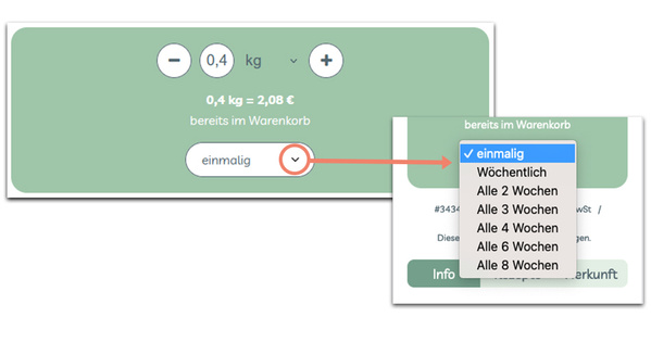 Du kannst bei jedem Artikel oder jeder Biokiste individuell wählen, ob du diese einmalig (für den ausgewählten Liefertag) oder für den von dir gewählten Lieferrhythmus erhalten möchtest. Hast du deine Bestellung abgeschickt, siehst du deine hinterlegten Abos im Profilbereich unter „Mein Abo“.