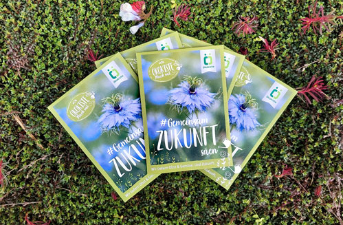 Unter dem Motto "Gemeinsam Zukunft sähen" verteilen die Mitgliedsbetriebe insgesamt 70.000 Tütchen Blumensamen in den Kisten vor Ostern. Diese Saatmischung wurde extra für den Verband vom Sattguthersteller Bingenheimer erstellt und beeinhaltet die Sorten Jungfer im Grünen, Goldmohn und roter Lein.