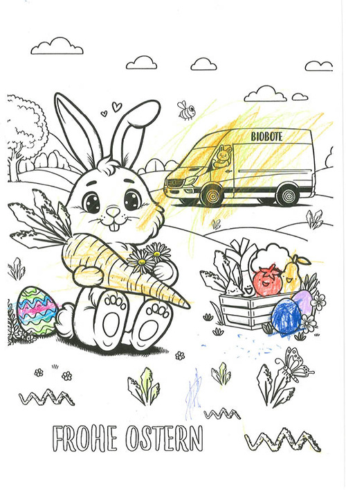 KI generiert: Ein Osterhase mit Möhre sitzt in einer Landschaft, daneben ein "BIOBOTE"-Lieferwagen. Text: "FROHE OSTERN".