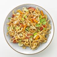 Bio-Gemüsemischung (58%) mit Bandnudeln nach asiatischer Art, exotisch abgeschmeckt, tiefgefroren.