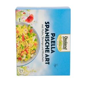 52% Reis* gegart (Wasser, Reis*, Speisesalz, Kurkuma*), Erbsen*, 7% Hühnerfleisch* gegart, Gemüsepaprika*, BUTTER*, 5% SHRIMPS** (SHRIMPS**, Speisesalz), 3,5% MUSCHELN** gegart, Zwiebeln*, Champignons*, Tomaten*, Meersalz, Roh-Rohrzucker*, Gewürze* (Knoblauch*, Pfeffer*, Chili*, Kurkuma*), Reismehl*, Kräuter* (Oregano*, Thymian*, Basilikum*), Gemüsepulver* (Zwiebeln*, Pastinaken*, Karotten*), Olivenöl*.| Energie | Fett | gesättigte Fettsäuren | Kohlenhydrate | Zucker | Ballaststoffe | Eiweiss | Salz |