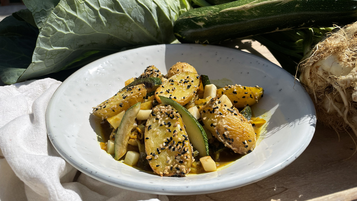 8. Das Gemüse auf Teller anrichten und zusammen mit den Sesamkartoffeln servieren.