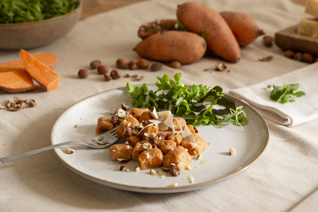 7. Die Gnocchi in die Pfanne zur Haselnussbutter geben und kurz darin schwenken. Mit frisch geriebenem Parmesan servieren.