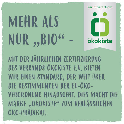 "Ökokiste" ist die gemeinsame Marke von über 40 zertifizierten Bio-Lieferbetrieben aus ganz Deutschland. Jeder einzelne hat sich mit Leib und Seele der Idee „Bio“ verschrieben. So garantiert Ihnen die Ökokiste frische Bio-Lebensmittel aus ökologisch kontrollierter Landwirtschaft.